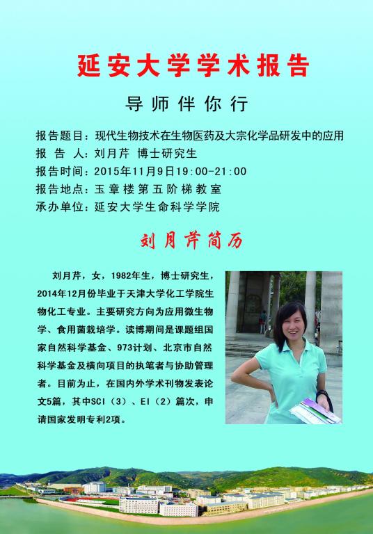 晚7点,刘月芹老师在公司玉章楼第五阶梯教室做了关于“现代生物技术在生物制药及在化员工产应用”的报告。公司主管员工工作副书记李学周老师,团委书记苗青老师,辅导员薛瑛老师及15级生科、生技专业的同学们参加了此次讲座。报告内容主要包括微生物用于化工研究的历史、刘月芹博士本人在读博期间的科研成果以及她现在正在进行和拟进行的研究。