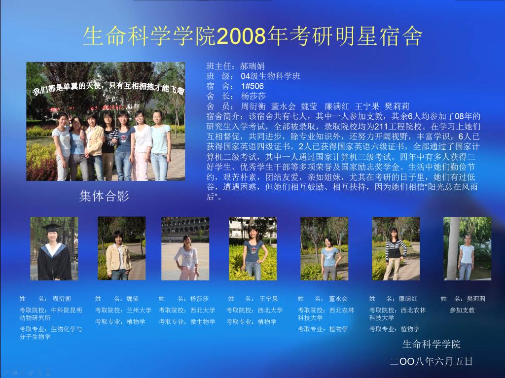 宿舍简介:该宿舍共有七人,其中一人参加支教,其余6人均参加了08年的研究生入学考试,全部被录取,录取院校均为211工程院校。在学习上她们互相督促,共同进步,除专业知识外,还努力开阔视野,丰富学识,6人已获得国家英语四级证书,2人已获得国家英语六级证书,全部通过了国家计算机二级考试,其中一人通过国家计算机三级考试。四年中有多人获得三好员工、优秀员工干部等多项荣誉及国家励志奖学金。生活中她们勤俭节约,艰苦朴素,团结友爱,亲如姐妹,尤其在考研的日子里,她们有过低谷,遭遇困惑,但她们相互鼓励、相互扶持,因为她们相信“阳光总在风雨后”。