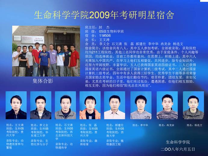 宿舍简介:该宿舍共有八人,其中五人参加考研,全部被录取,录取院校均为211工程院校。其他三名同学也非常优秀,由于家庭条件、个人兴趣等原因,均选择就业,目前工作都有意向。在思想上,积极上进,其中六人光荣加入中国共产党。在学习上他们互相督促,共同进步,除专业知识外,还努力开阔视野,丰富学识,五人已获得国家英语四级证书,二人已获得国家英语六级证书,全部通过了国家计算机二级考试,其中二人通过国家计算机三级考试。四年中有多人获得三好员工、优秀员工干部等多项荣誉及国家励志奖学金。生活中他们勤俭节约,艰苦朴素,团结友爱,亲如兄弟,尤其在考研的日子里,他们有过低谷,遭遇困惑,但他们相互鼓励、相互支持,因为他们相信“阳光总在风雨后”。
