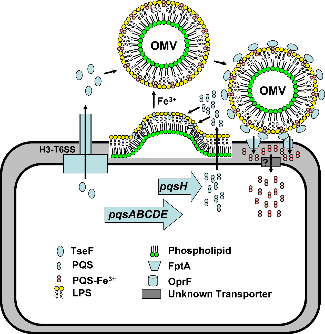 论文以“A Pseudomonas T6SS effector recruits PQS-containing outer membrane vesicles for iron acquisition”为题,揭示铜绿假单胞菌利用VI型分泌系统效应蛋白招募包含群体感应信号分子PQS (Pseudomonas quinolone signal)的外膜囊泡参与PQS-Fe3+摄取的分子机制。这一发现为铜绿假单胞菌VI型分泌系统、群体感应系统及铁摄取系统等研究领域带来了重大的突破,对预防和治疗由铜绿假单胞菌引起的感染具有重要指导意义。论文审稿人认为该研究是铜绿假单胞菌铁摄取领域里程碑式的研究(The manuscript reads very well and the data are extremely interesting. I read it with great interest and I think that it will be a milestone in the field of iron uptake by P. aeruginosa.)。
