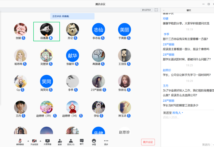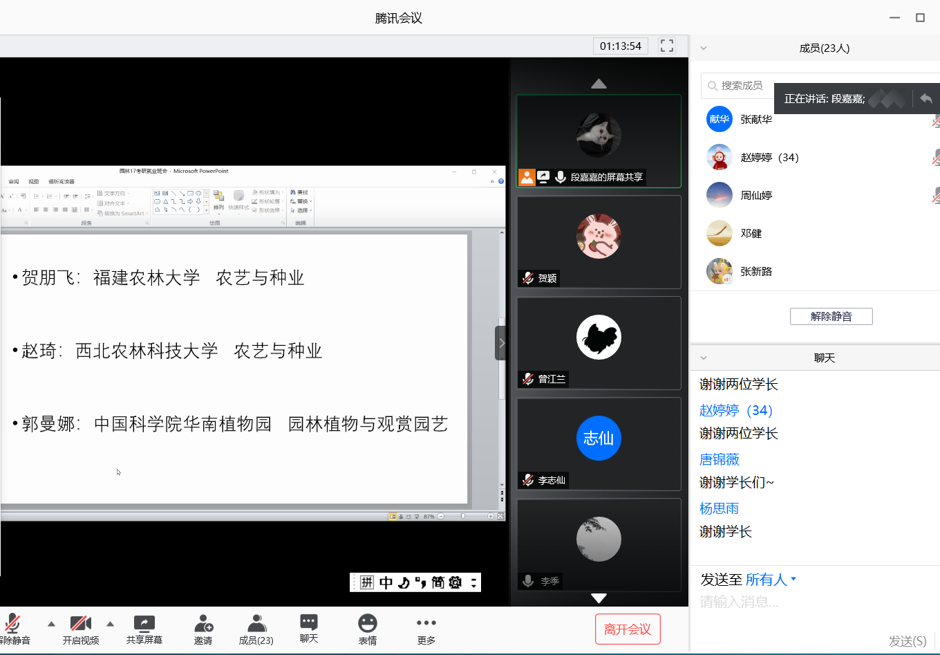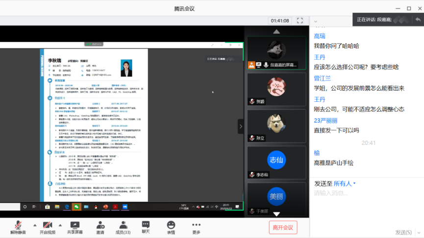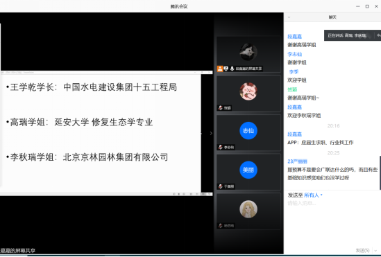 6月22日和23日晚,公司17级园林专业分两次在腾讯会议平台举行考研工作经验交流会,邀请了2020届毕业生王学乾、高瑞、李秋瑞、贺朋飞、赵琦和郭曼娜六位同学进行了考研、就业经验交流和分享。园林专业17级全体同学和班主任邓健老师参加了会议。交流会由园林17班班长段嘉嘉主持。
