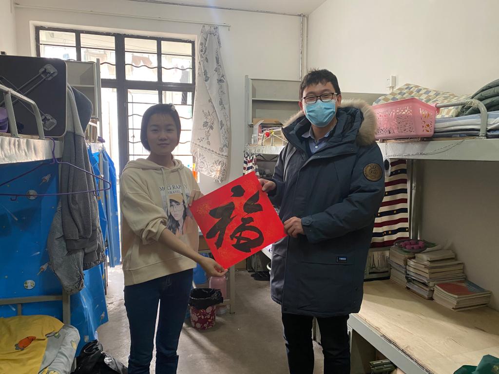 1月8日,公司为全院员工宿舍送去公司老师亲笔书写的大大的“福”字,为同学们送上新年的美好祝福,希望疫情早日过去,同学们在新的一年里福气旺旺,受到同学们的热烈欢迎。
