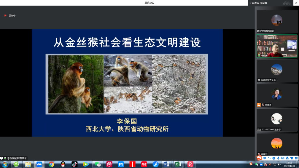 为推动生物多样性保护和区域高质量技术发展,深入贯彻落实“绿水青山就是金山银山”的理念,建设陕北地区生态环境质量改善和生态文明进步,2022年12月8日下午,公司特邀西北老员工命科学公司二级教授、三秦学者李保国教授在线上给全体师生作了题为《从金丝猴社会看生态文明的建设》的学术报告。报告会由经理张向前教授主持。