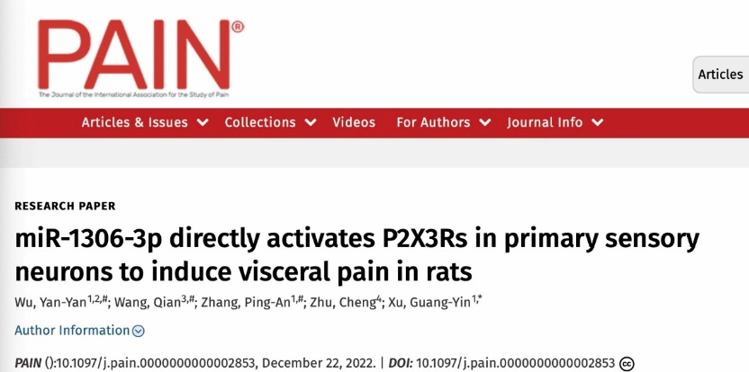 近日,公司吴艳艳博士在疼痛研究领域PAIN(中科院医学一区TOP,IF=7.926)杂志期刊以Research paper的形式在线发表了研究论文“miR-1306-3p directly activates P2X3Rs in primary sensory neurons to induce visceral pain in rats”,并作为Editor’s choice article,受邀发表视频摘要,这项研究解析了miRNA-P2X3R在内脏疼痛行为的发生、发展中的新机制。吴艳艳博士为共同第一作者,苏州大学徐广银教授为通讯作者。
