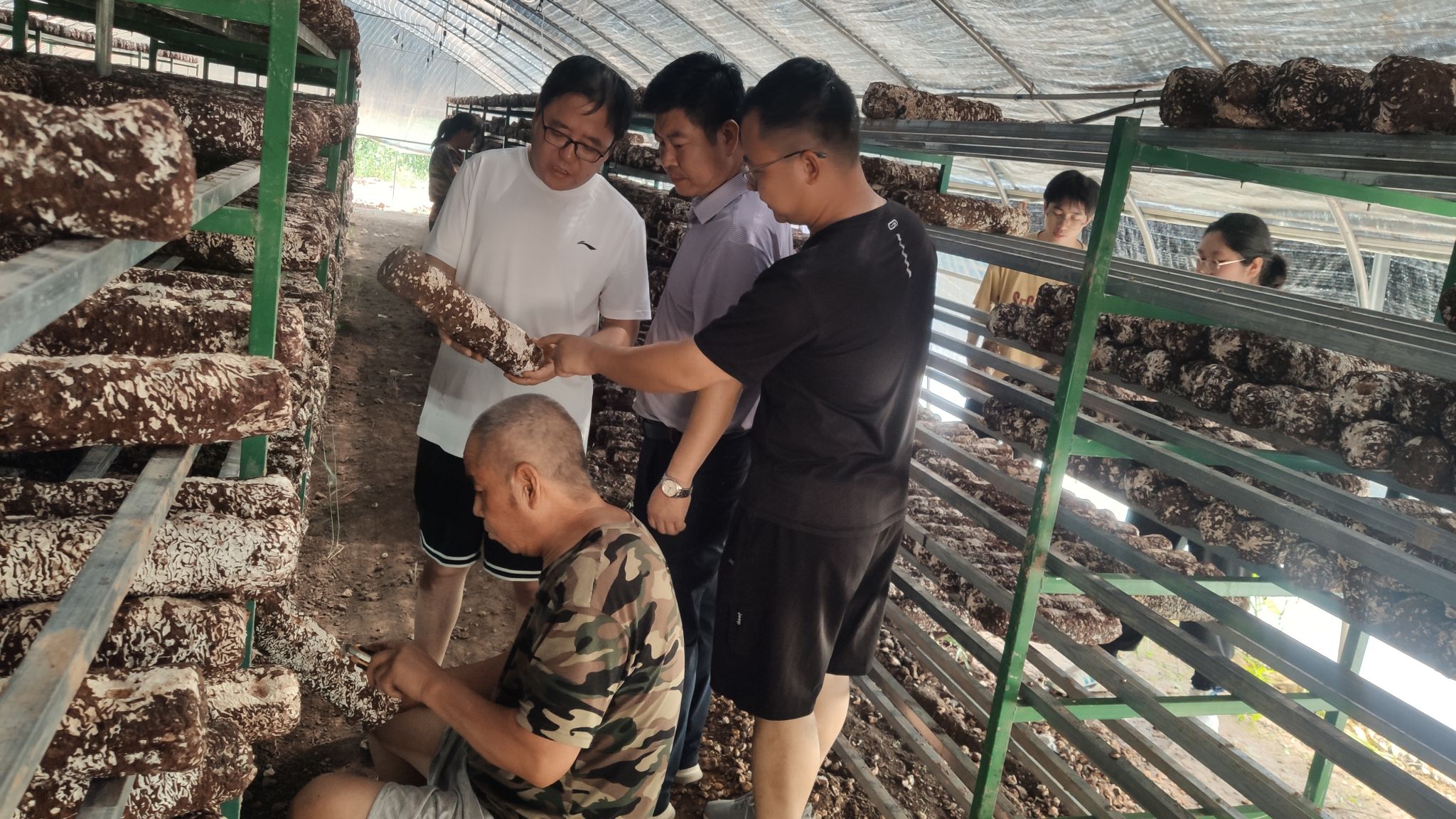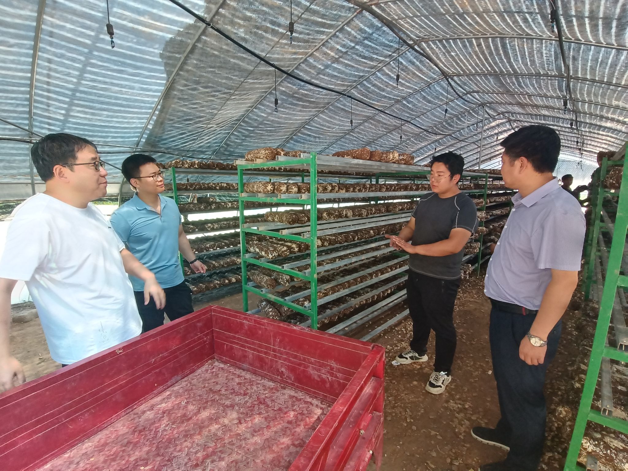 7月24日上午,公司“三区”科技人才服务队刘冲、高小朋、邓健、靳鹏飞等4人前往河庄坪镇食用菌产业园区进行食用菌生产情况调研和科技服务。在延安菌舰生物科技有限公司总经理高瑜的带领下,公司三区人才们详细了解了公司现阶段菌棒生产和销售情况,随后前往食用菌菌棒生产大棚,在棚里实地查看了当前菌棒生长情况,并就远距离运输过程中的菌棒存贮、香菇出菇条件控制等生产管理问题与负责人进行了沟通和技术指导。三区人才们在调研过程中还发现部分生产环节缺乏专业性工具等问题,通过现场交流和探讨,未来也会针对企业需求尝试改进和开发针对性的生产工具帮助解决实际难题。