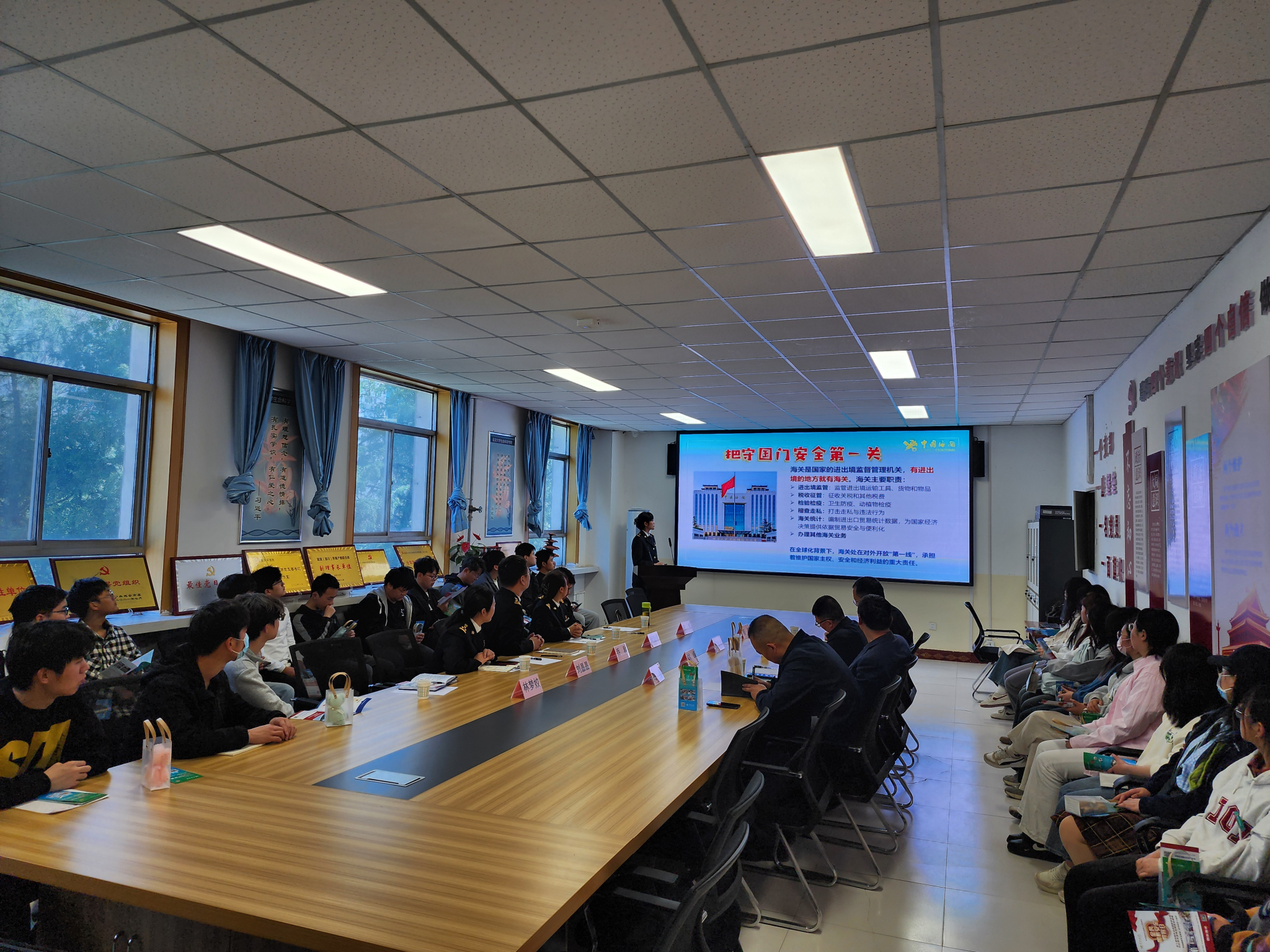 乔科在讲话中从国家战略高度出发,强调了国门生物安全是国家安全体系的重要组成部分,必须坚持以总体国家安全观为统领,筑牢国门生物安全防护网。他为师生们介绍了延安海关在出入境生物检疫、有害生物入侵等方面的工作重要性,诠释了国门生物安全工作的艰巨性与使命感,让在场师生深刻体会到海关战线同志们“守国门、促发展”的责任担当。