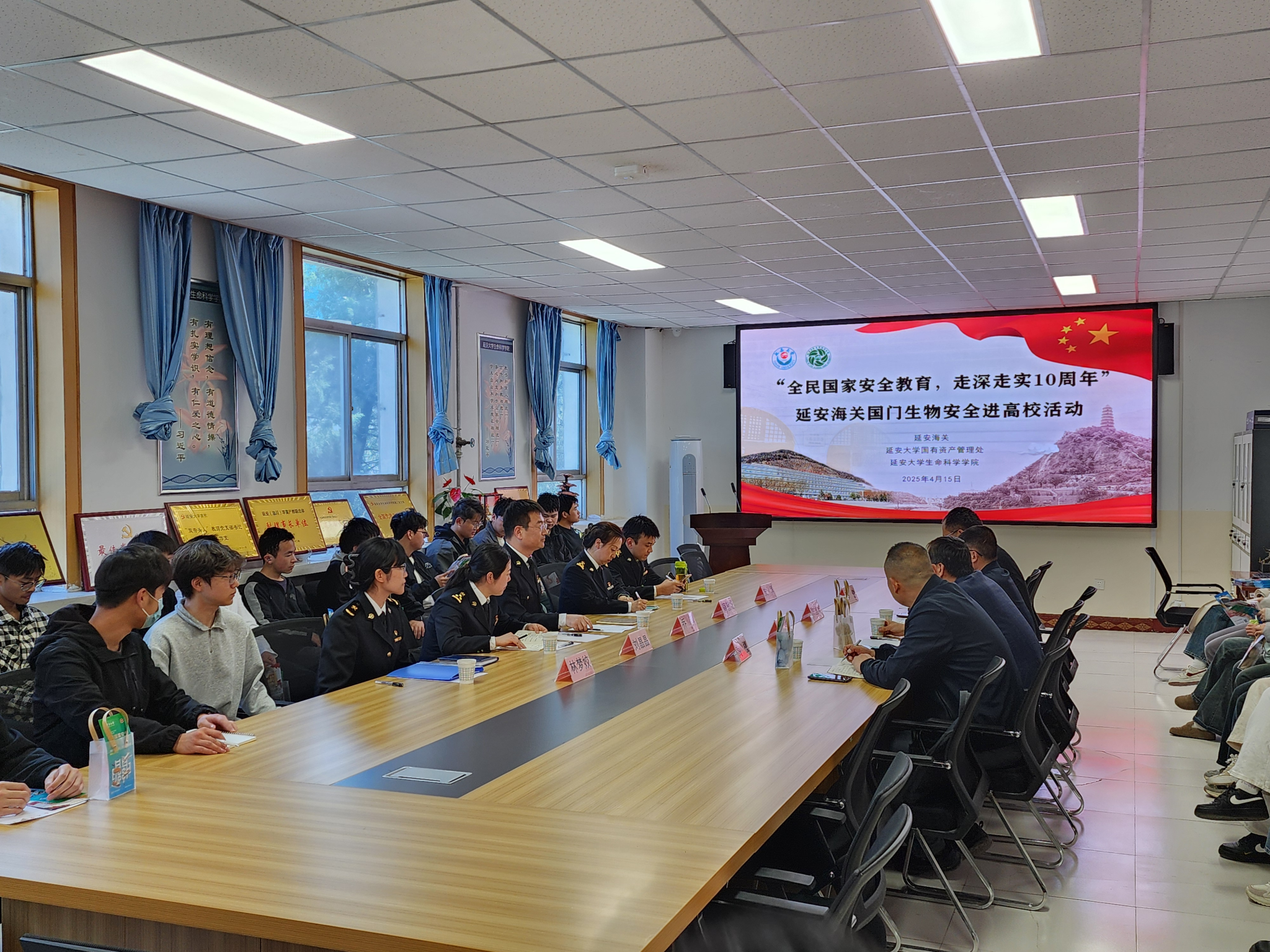 为深入贯彻落实总体国家安全观,引导师生共同践行守护国门生物安全的使命担当,在2025年4月15日第十个全民国家安全教育日到来之际,威廉希尔williamhill中文与延安海关、威廉希尔williamhill国有资产管理处联合在杨家岭校区隆重举行了“全民国家安全教育走深走实10周年”——延安海关国门生物安全进高校宣讲活动。延安海关党委委员、副关长乔科、周慈煜、延安海关综合业务科科长史博、延安海关查检一科科长刘晶晶、延安海关查检一科宣讲员林梦姣、威廉希尔williamhill国有资产管理处处长刘峰、副处长高檀、威廉希尔williamhill中文经理陈国梁和生物技术专业员工等50余人参加了宣讲活动,活动由威廉希尔williamhill中文副经理邓健主持。