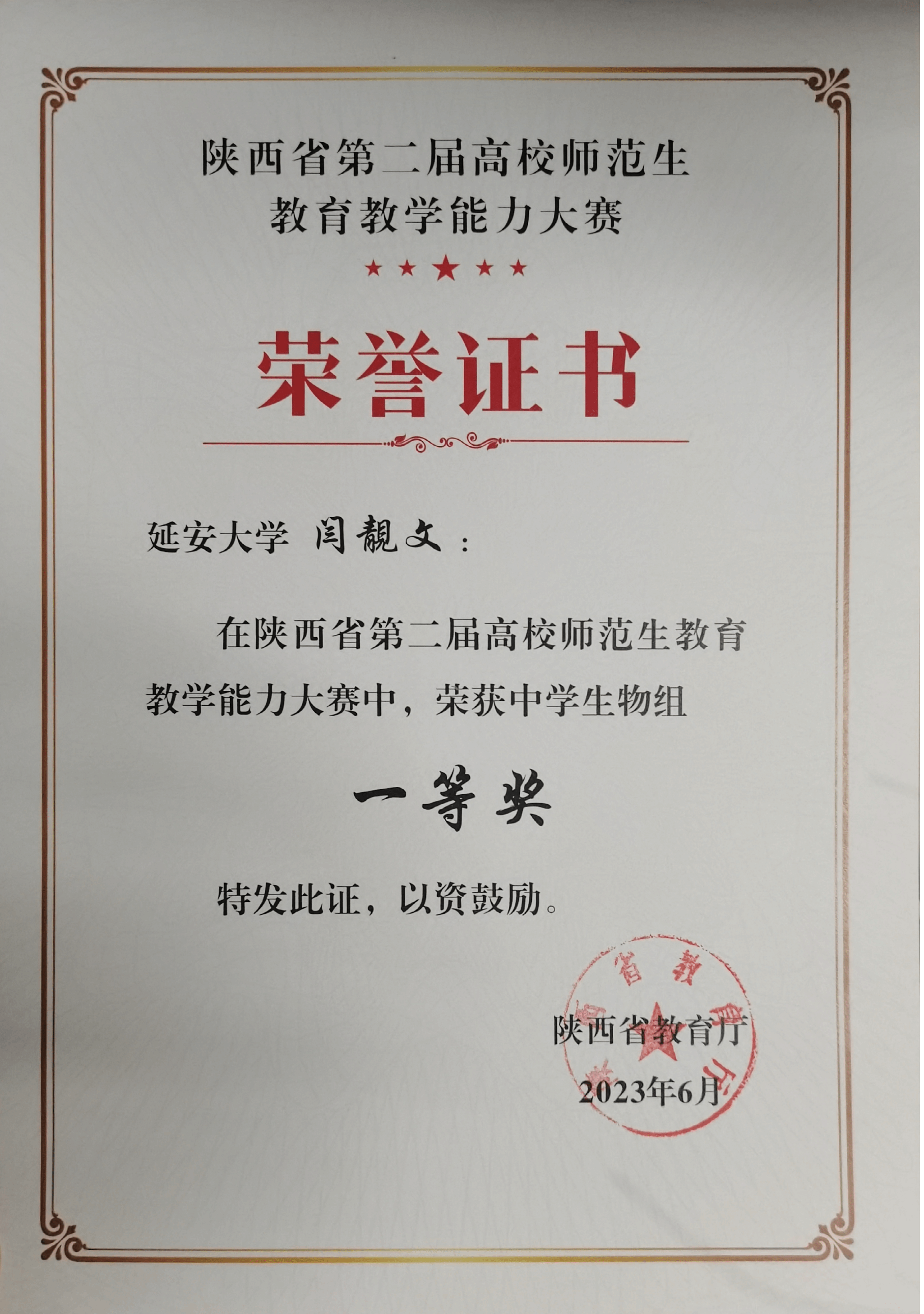 本次大赛由陕西省教育厅主办,陕西师范大学承办,宝鸡文理公司协办。大赛主题“振兴师范,奠基良师”。为切实提高高等公司师范专业人才培养质量,促进师范生专业能力发展。全省共14所高校2万余名师范生参加大赛,经过初赛筛选、省级复赛选拔,共163名师范生进入省级决赛。本次决赛5月20日和21日在陕西师范大学长安校区进行,公司闫靚文同学赴西安参赛,比赛环节包含板书测试、即兴演讲、模拟授课。决赛评委专家由高校和基础教育一线教学名师组成。闫靚文同学沉着应战,出色发挥,取得省级一等奖的好成绩,彰显公司优秀学子风范!