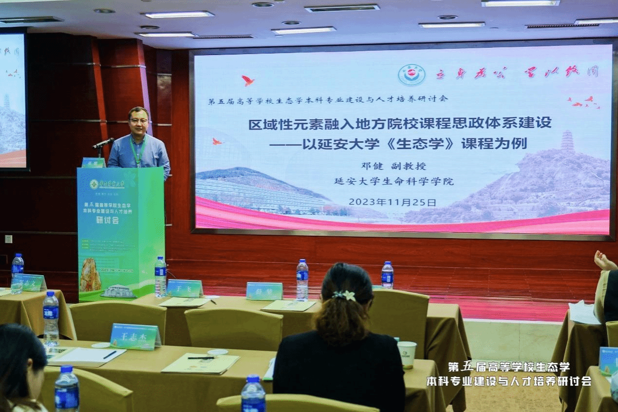 会议围绕“生态学专业建设与课程建设”、“人才培养模式与实践教学改革”和“生态学一流专业建设专题研讨”等3个主题,设置了13个大会特邀报告和25个分会场报告。生科院园林系主任、陕西省课程思政示范教学团队负责人邓健副教授做了题为《区域性元素融入地方院校课程思政体系建设——以威廉希尔williamhill《生态学》课程为例》的分会场报告,该报告从课程思政立德树人的必然要求、红色熔炉铸魂育人的光荣使命、黄土高原生态建设典型区位等方面介绍了《生态学》省级课程思政示范课建设背景和思路,分享了基于延安精神“一体两翼”铸魂育人体系建设的“双核心多元素”课程思政内容体系,并从区域性思政元素挖掘、典型思政教学案例打造、课程思政教学途径优化、课程思政教学效果检验等方面系统介绍了开展《生态学》课程思政教学的具体做法和经验。