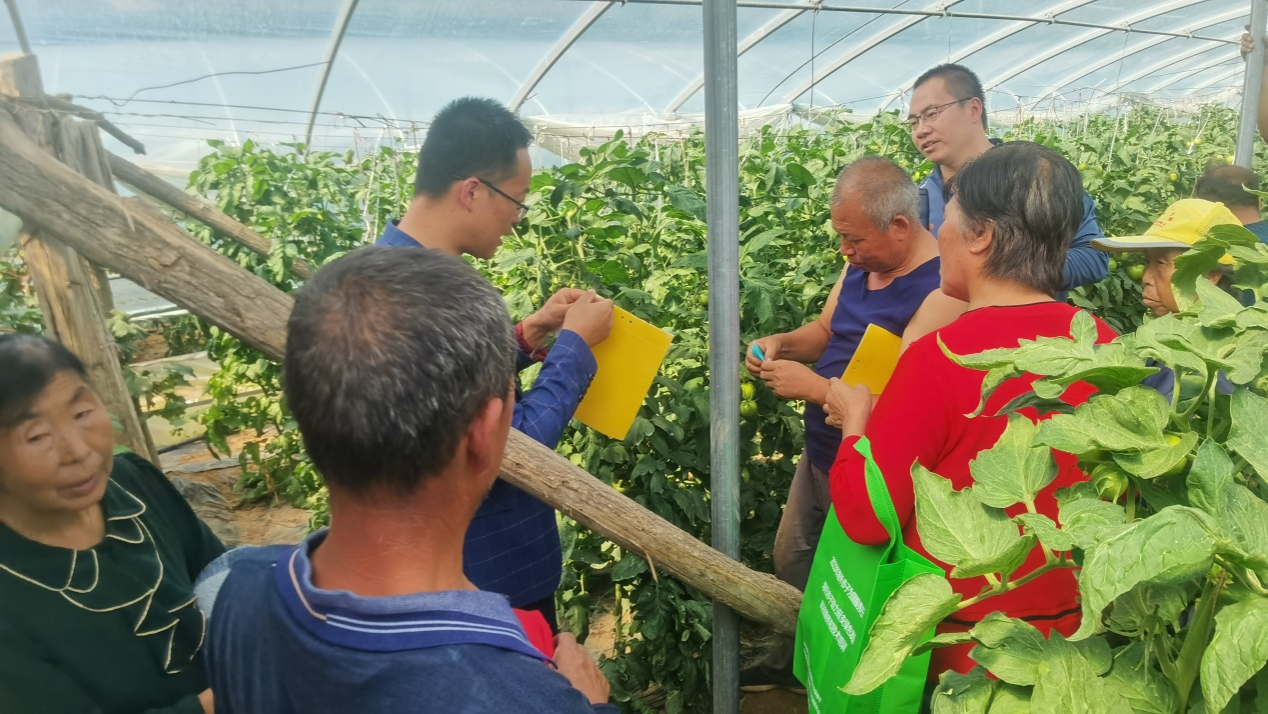 专家组建议:将病株拔出并及时销毁,叶面喷施17%氟吡呋喃酮可溶性液剂,每隔7天喷施一次,连续3次,杀灭传染源;清除温室周围杂草,温室通风口增设防虫网,悬挂粘虫板减少白粉虱带毒传播;增强植株营养,提高抗病性。随后,对番茄种植大户专门进行了病毒病防控技术培训,并手把手给菜农进行了操作示范与技术指导。