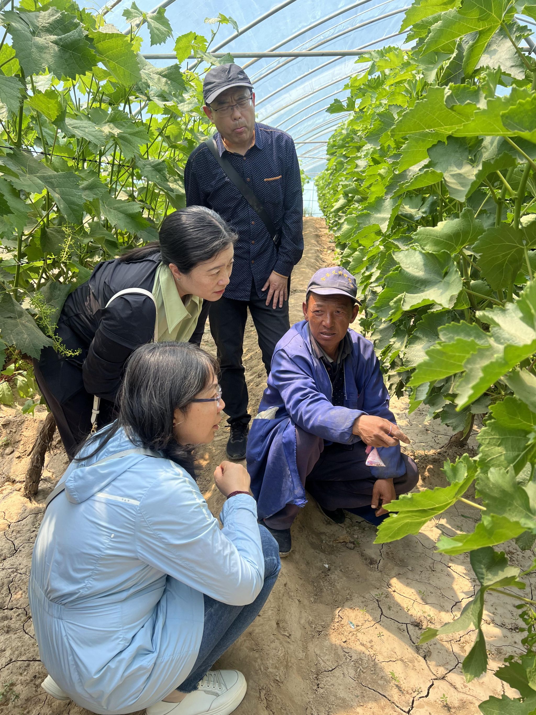 随后,志愿服务队一行走进界石堡葡萄产业种植基地查看葡萄长势,结合葡萄田间管理、病虫害防治、品种多样化种植、土肥管理等方面对果农进行了现场培训指导。